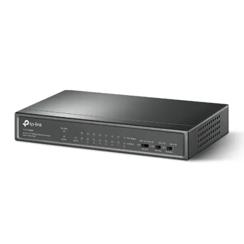 The TP-Link TL-SF1009P 9-Port 10/100Mbps Desktop Switch offers up to 30 W per PoE port by the 802.3af/at PoE+ standard. The total 65 W PoE power budget for the 8 PoE+ ports enables various applications, including monitoring for workplaces, dorms, and small companies. It works with IP cameras, access points, IP phones, laptops, printers, and other devices.